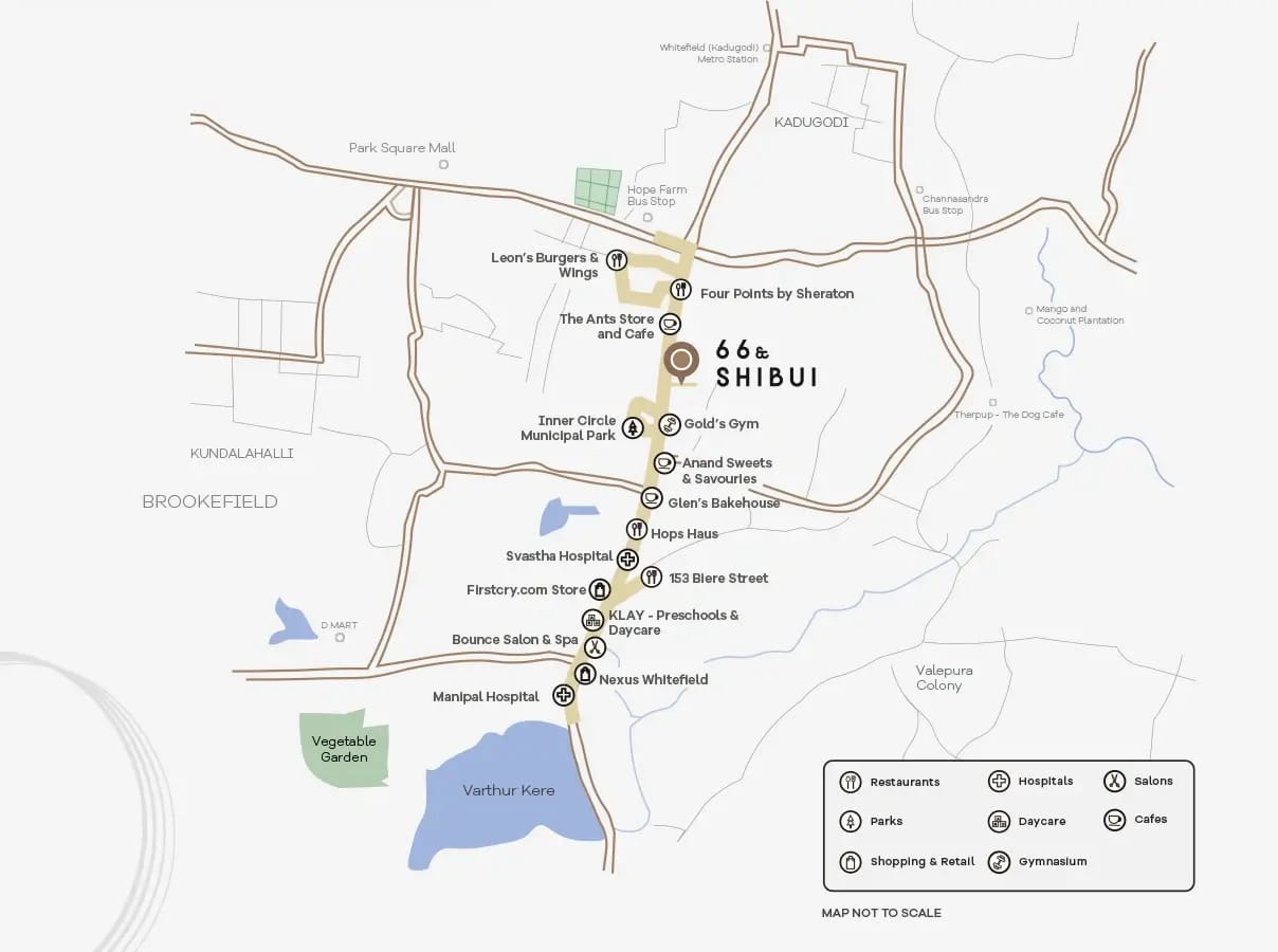 Strategically located on Whitefield Main Road, Assetz 66 & Shibui by Assetz Property Group enjoys a premium address in one of East Bangalore’s most sought-after tech and residential corridors. Positioned close to major IT hubs, malls, metro access points, and social infrastructure, the project offers excellent connectivity along with strong lifestyle convenience.